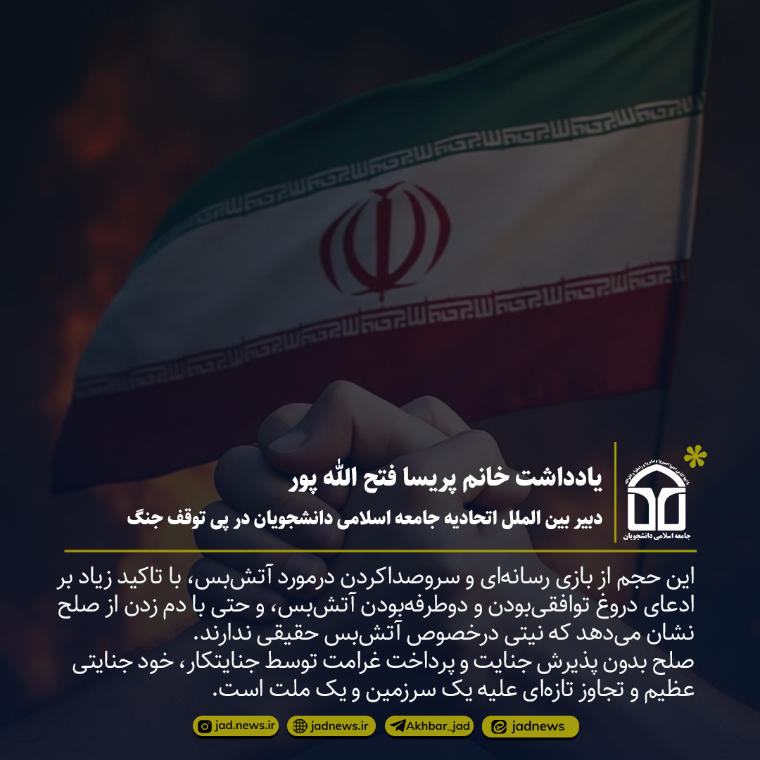 این حجم از بازی رسانهای و سروصداکردن درمورد آتشبس، با تاکید زیاد بر ادعای دروغ توافقیبودن و دوطرفهبودن آتشبس، و حتی با دم زدن از صلح نشان میدهد که آنها نیتی درخصوص آتشبس حقیقی ندارند. صلح بدون پذیرش جنایت و پرداخت غرامت توسط جنایتکار، خود جنایتی عظیم و تجاوز تازهای علیه یک سرزمین و یک ملت است.