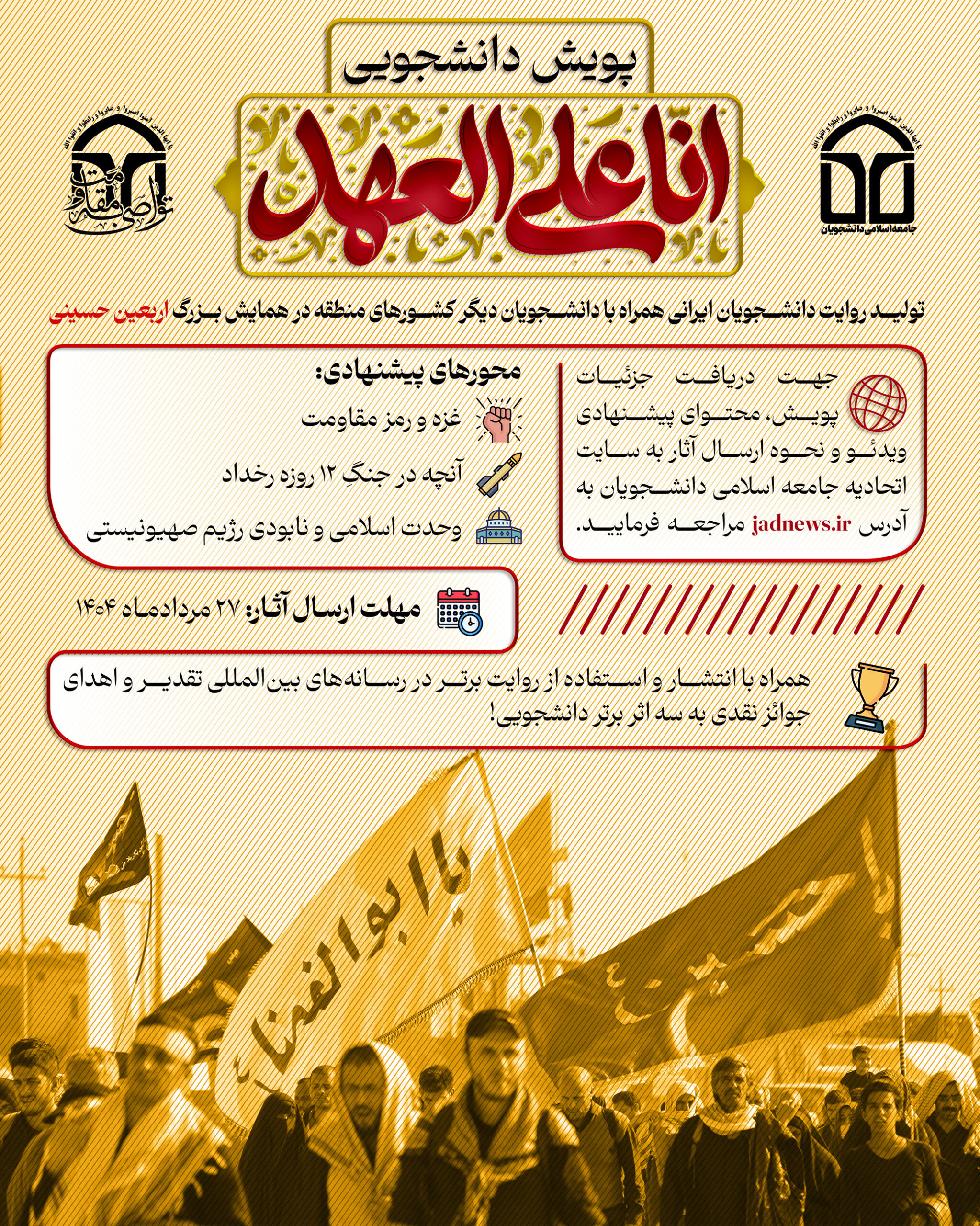 در نظر داریم دانشجویان محترم ایرانی ذیل شعار امسال ستاد اربعین حسینی « انا علی العهد» پویشی در قالب تولید روایت های دانشجویی در سه بخش مختلف ایفای نقش نمایند.